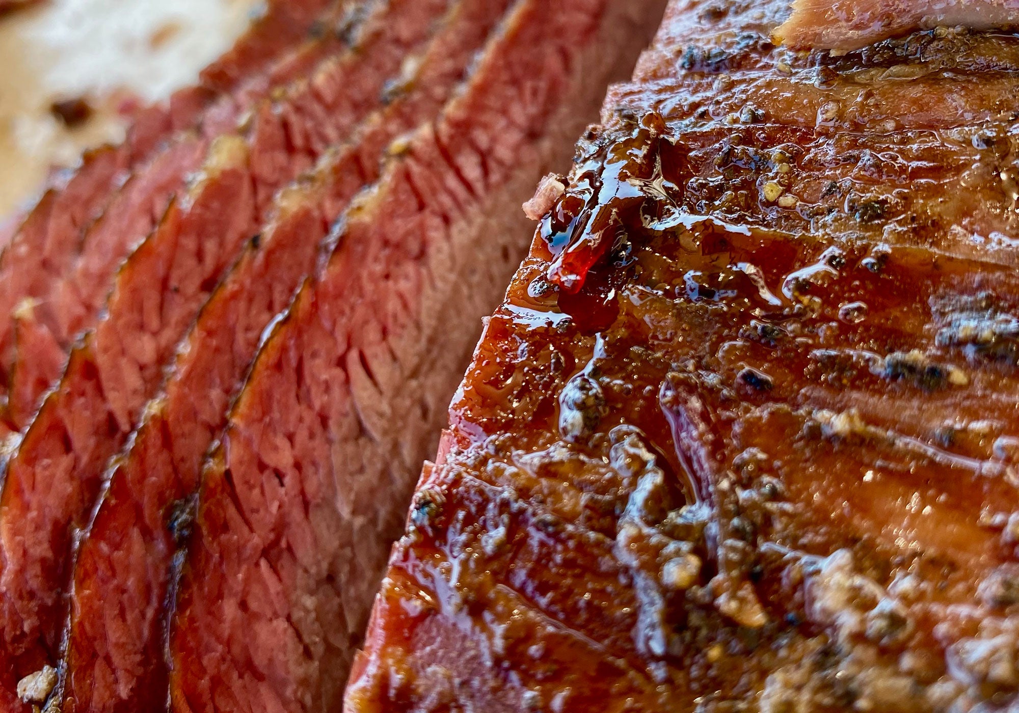 A clear bottle labeled 'Big Poppa's Cattle Prod Beef Injection Seasoning', with a dark maroon label featuring white and gold text and a graphic of a cattle in a field. Established in 2010.Thick slices of seasoned brisket with a rich bark and pink smoke ring, served on a white plate, demonstrating the juicy and tender texture of the meat.